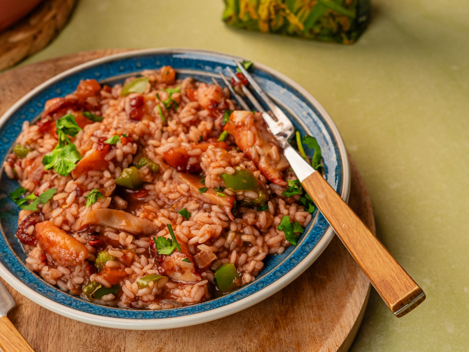 Sirva o arroz de polvo, sobreponha os tentáculos por cima e polvilhe coentros picados.