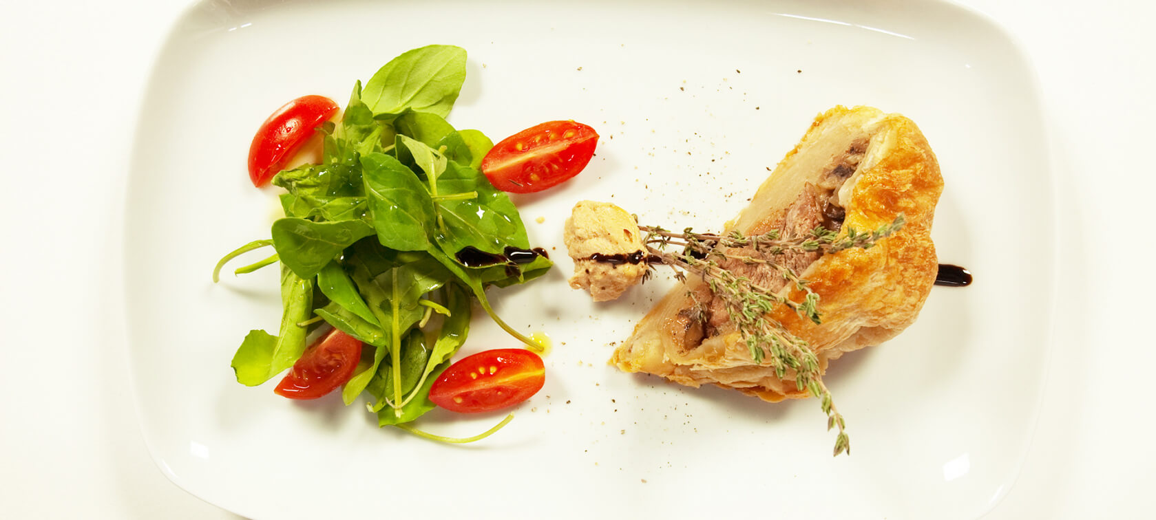Estique a massa folhada, com a ajuda do rolo da massa. Coloque a carne sobre a massa, regue com a pasta de cogumelos e um pouco de foie gras no topo. Corte a massa à medida e embrulhe. Pincele com gema de ovo, só para dar um pouco de cor. Coloque num tabuleiro e leve ao forno durante 15 minutos, até ficar dourada.