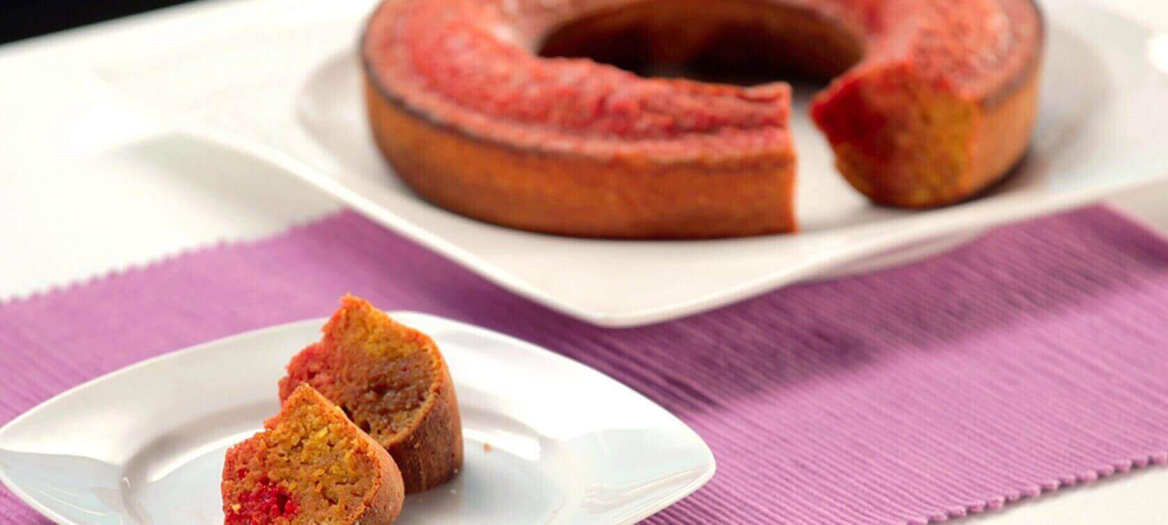 Misturar no liquidificador os ovos com o açúcar, acrescentar a beterraba, o óleo e o fermento. De seguida introduzir a farinha e envolver na massa.