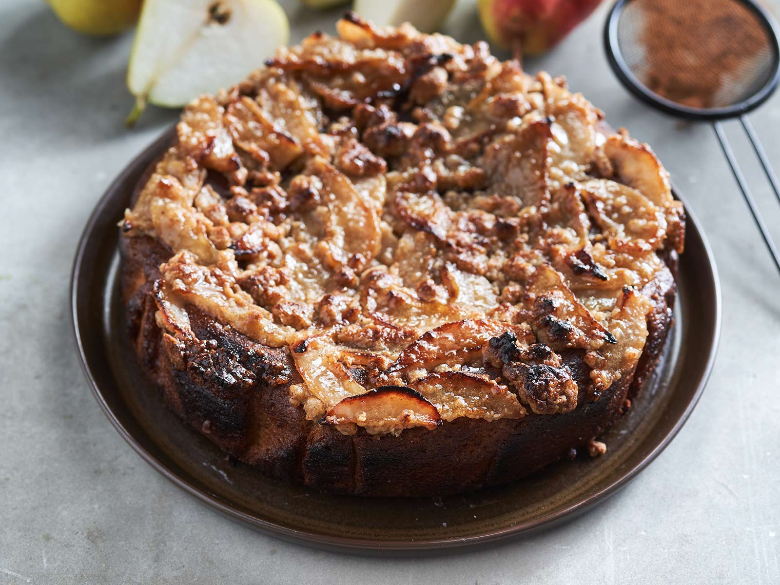Escorra bem os pedaços de pera, seque-os com papel de cozinha e misture-os na massa.