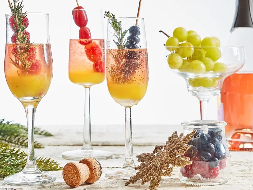Decore 6 copos de champanhe com frutos vermelhos ou uvas lavados espetados nos palitos.