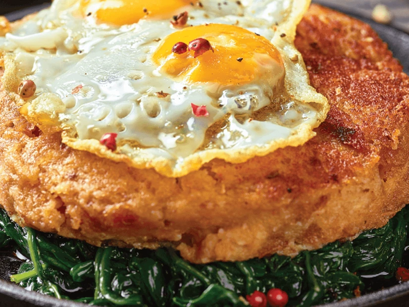 Faça uma cama com os espinafres, coloque os hambúrgueres por cima e finalize com os ovos e um pouco de pimenta rosa.