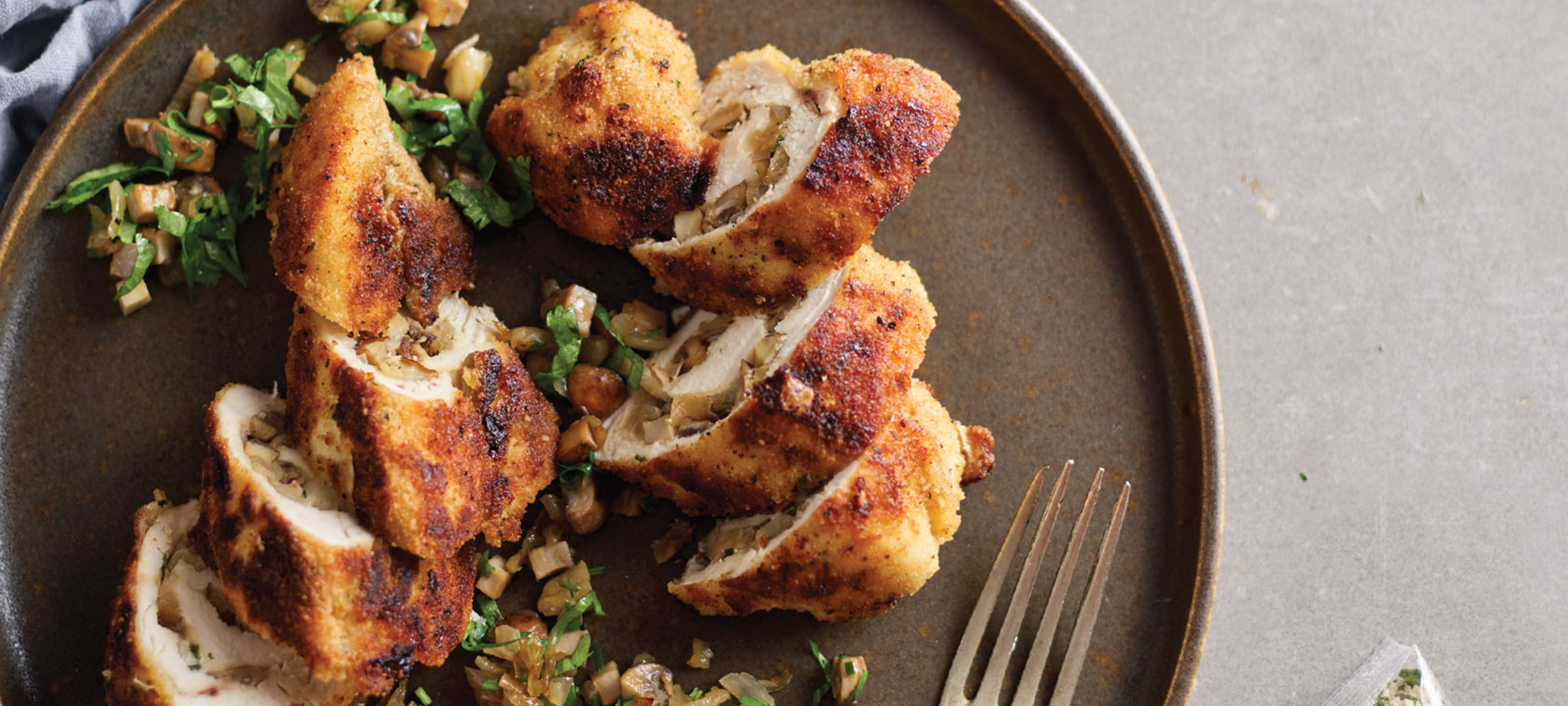 Misture muito bem o pão ralado com as ervas aromáticas. Bata ligeiramente os ovos. Passe os bifes de frango pela farinha, depois pelos ovos batidos e, por último, pelo pão ralado.