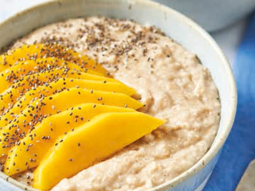 Divida as papas de aveia por 4 tigelas e disponha as mangas laminadas por cima.