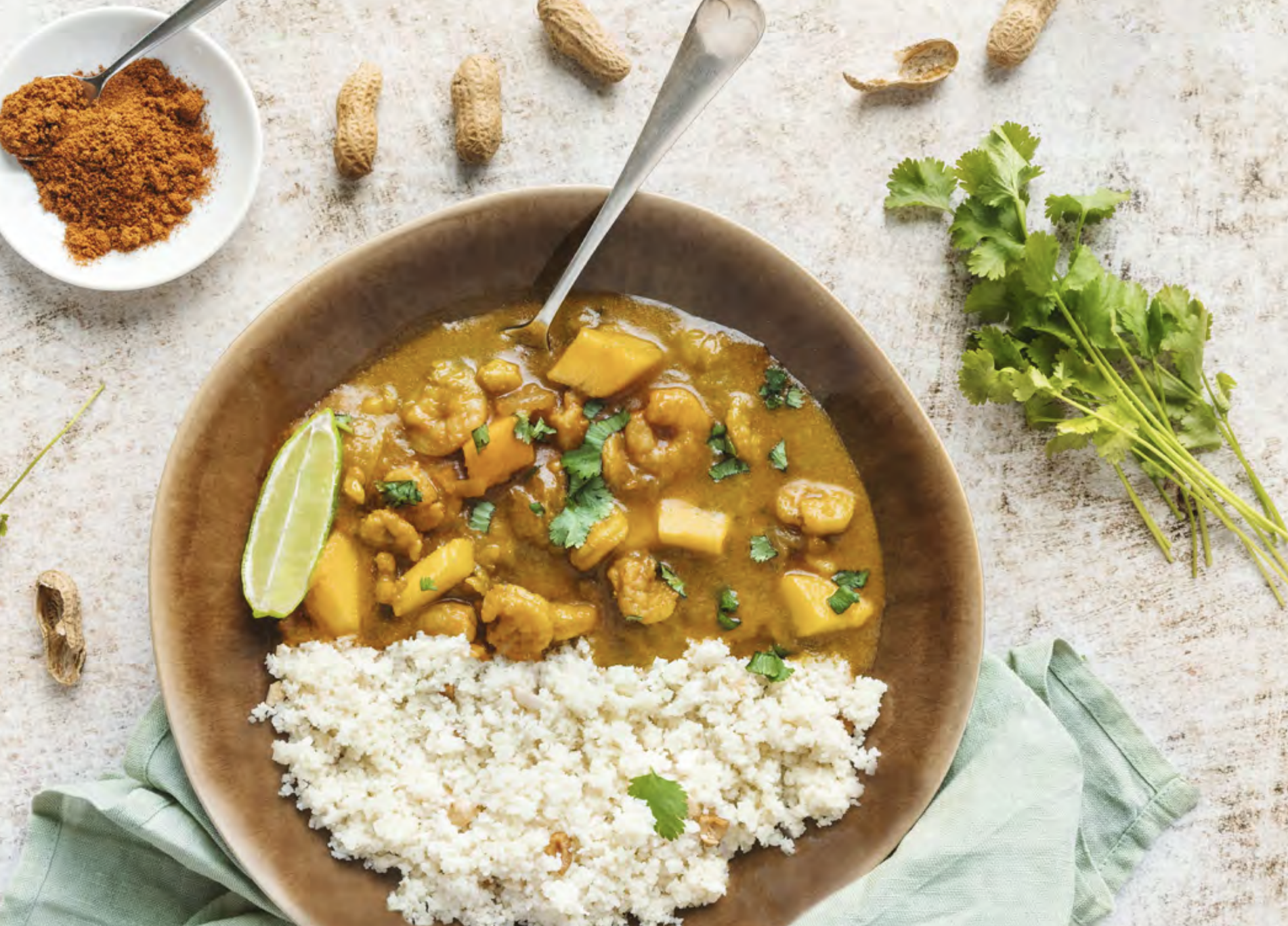 Entretanto prepare a marinada do camarão: coloque o miolo numa taça e junte o alho e gengibre em pó e regue com o sumo de 1 lima. Envolva bem e reserve.