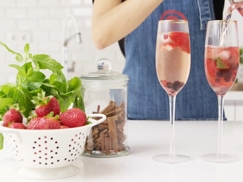 Colocar num jarro 150 g de frutos vermelhos congelados, 4 c. de sopa de açúcar mascavado e a garrafa de espumante.