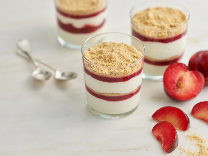 Monte o semifrio: coloque tudo por camadas em copos, começando pelo creme de natas, seguido do puré de ameixa e depois pelas bolachas trituradas.