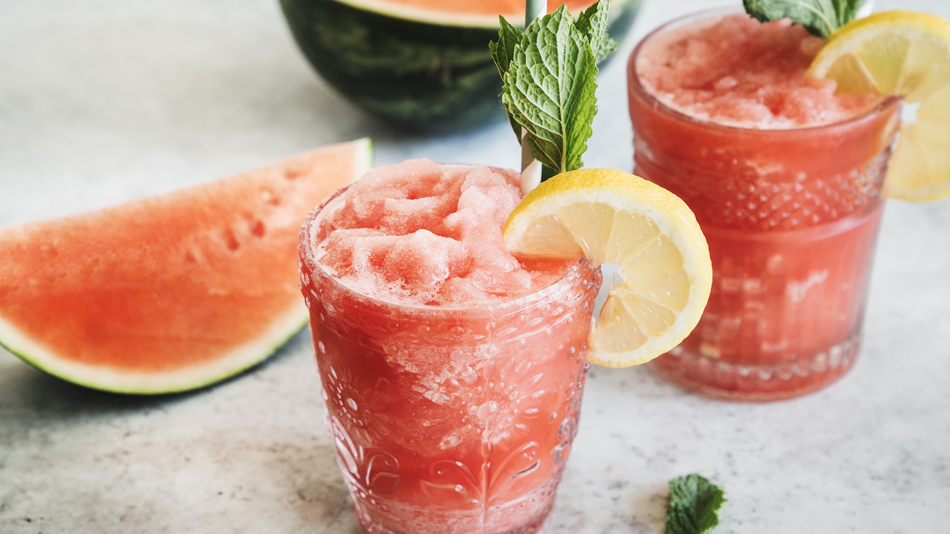 Entretanto corte a melancia a meio e corte-a em pedaços. De seguida, descasque o pepino, corte-o em pedaços e, de igual forma, corte o tomate em pedaços.