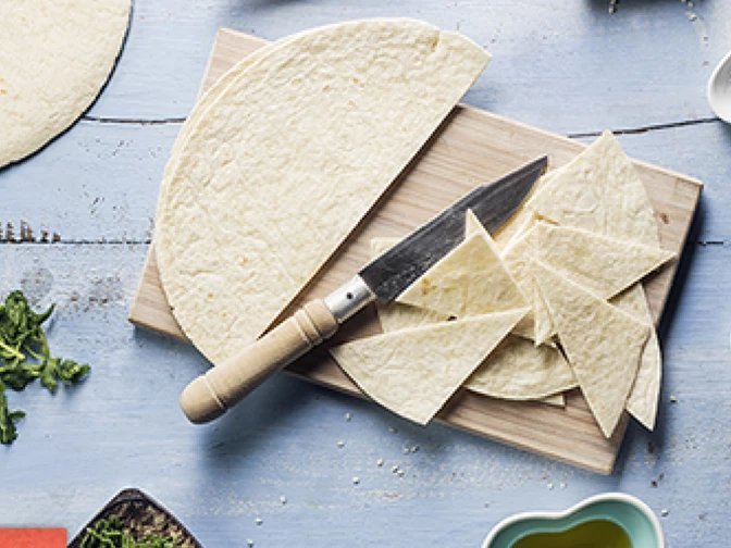 Corte as tortilhas em triângulos, pincele-os com azeite e polvilhe com paprica, sal e pimenta.