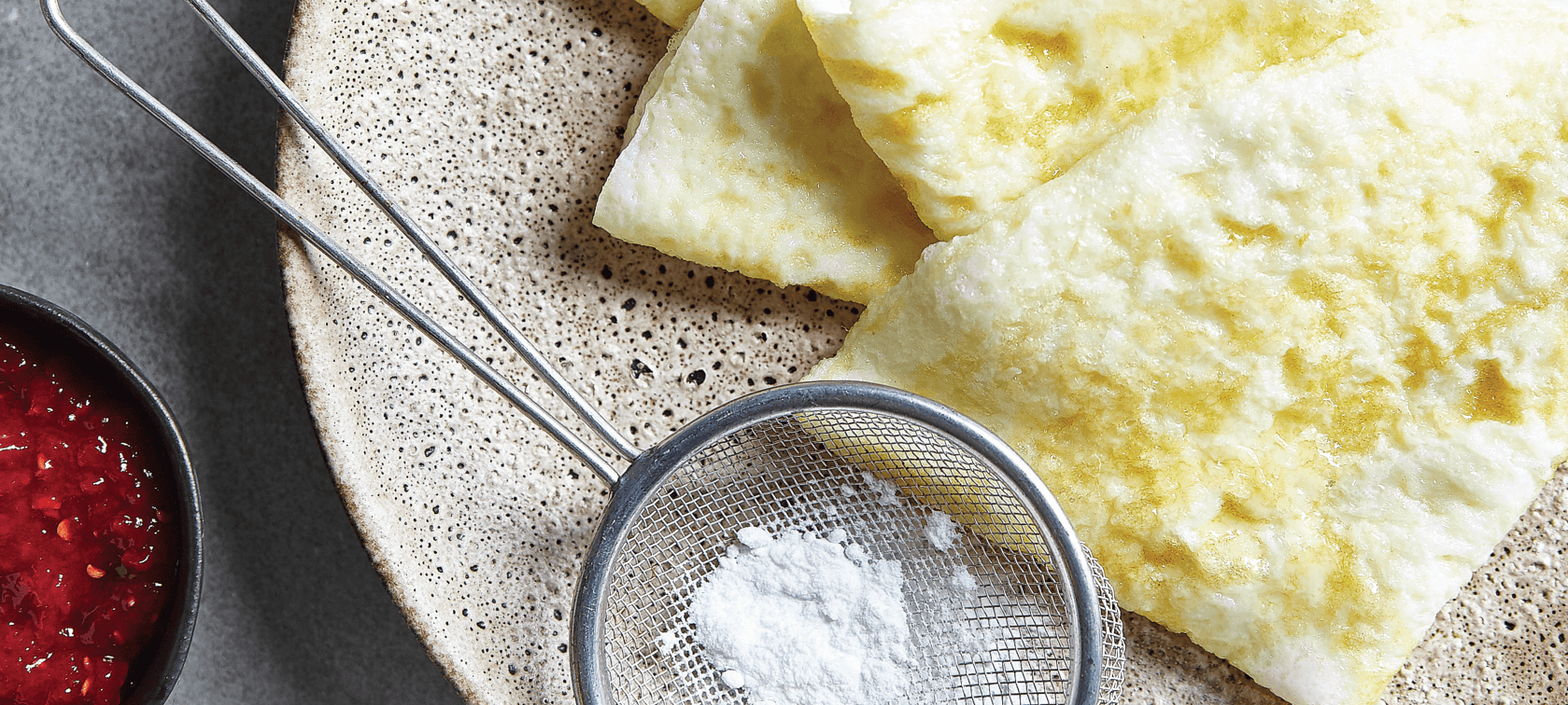 Numa taça, bata os ovos com o leite, o iogurte grego, o mel, a farinha, o fermento e uma pitada de flor de sal. Se necessitar, utilize uma batedeira. Deve obter uma massa homogénea e sem grumos.