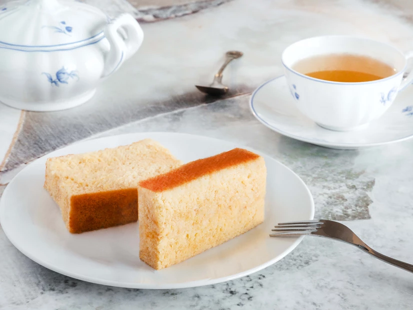 Retire o pão-de-ló e deixe-o arrefecer à boca do forno. Desenforme e sirva cortado em fatias retangulares de 3 cm, humedecendo a faca para deixar o corte mais reto.
