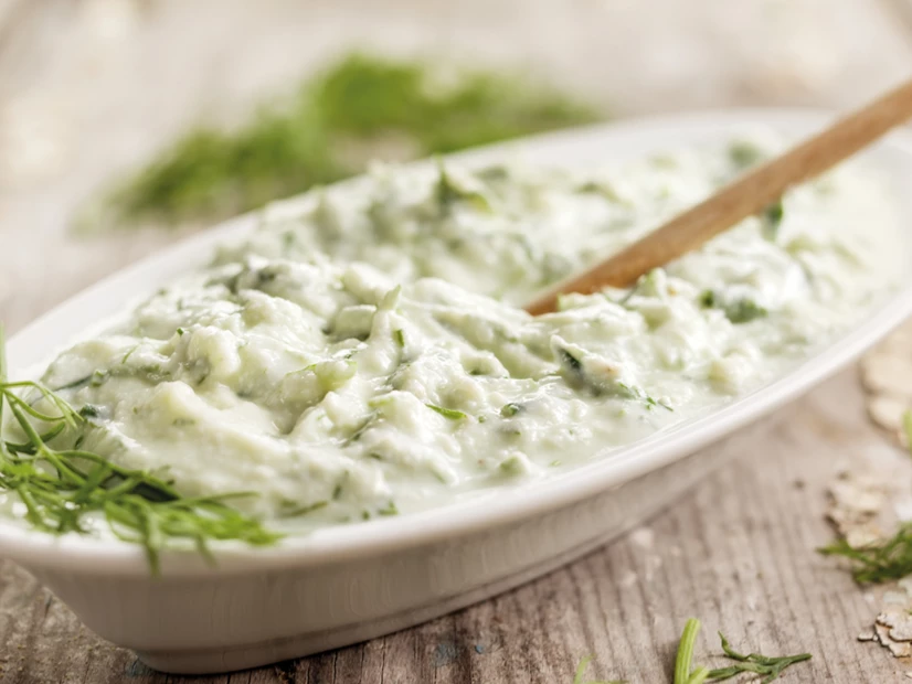 Com uma faca, corte grosseiramente o cebolinho e o aneto. Coloque‑os no copo, juntamente com o alho, e pique 10 segundos na velocidade 8. Com a ajuda da espátula, faça descer o que ficou acumulado nas paredes do copo e regule mais 10 segundos na velocidade 8. Repita o processo mais uma vez, se necessário.