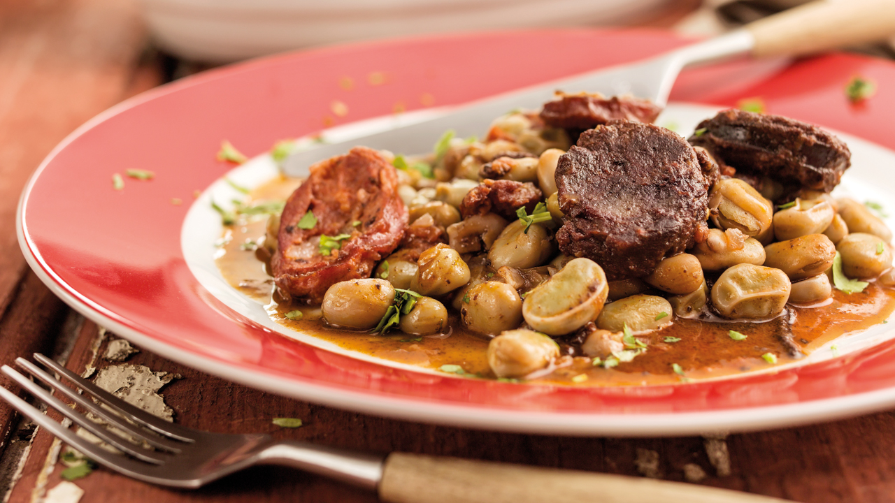 Acrescente a alheira, sem pele e desfeita em pedaços, e programe 1 minuto a 100ºc na velocidade 1 na Rotação Inversa. Com a espátula, faça descer o que se acumulou nas paredes do copo.