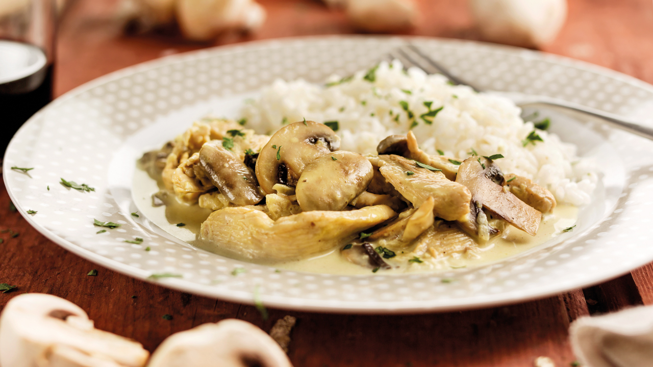 Incorpore as natas e a mostarda, retifique os temperos e programe 6 minutos, 100 °C, Rotação Inversa na velocidade 2. Verifique se o frango ficou bem cozinhado. Se necessário, programe mais 1‑2 minutos na mesma velocidade e temperatura.
