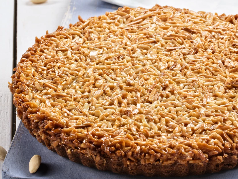 Espalhe a cobertura de amêndoa por cima e leve ao forno (a 190 °C) durante 25‑30 minutos aproximadamente. Retire‑a do forno quando estiver dourada à superfície.